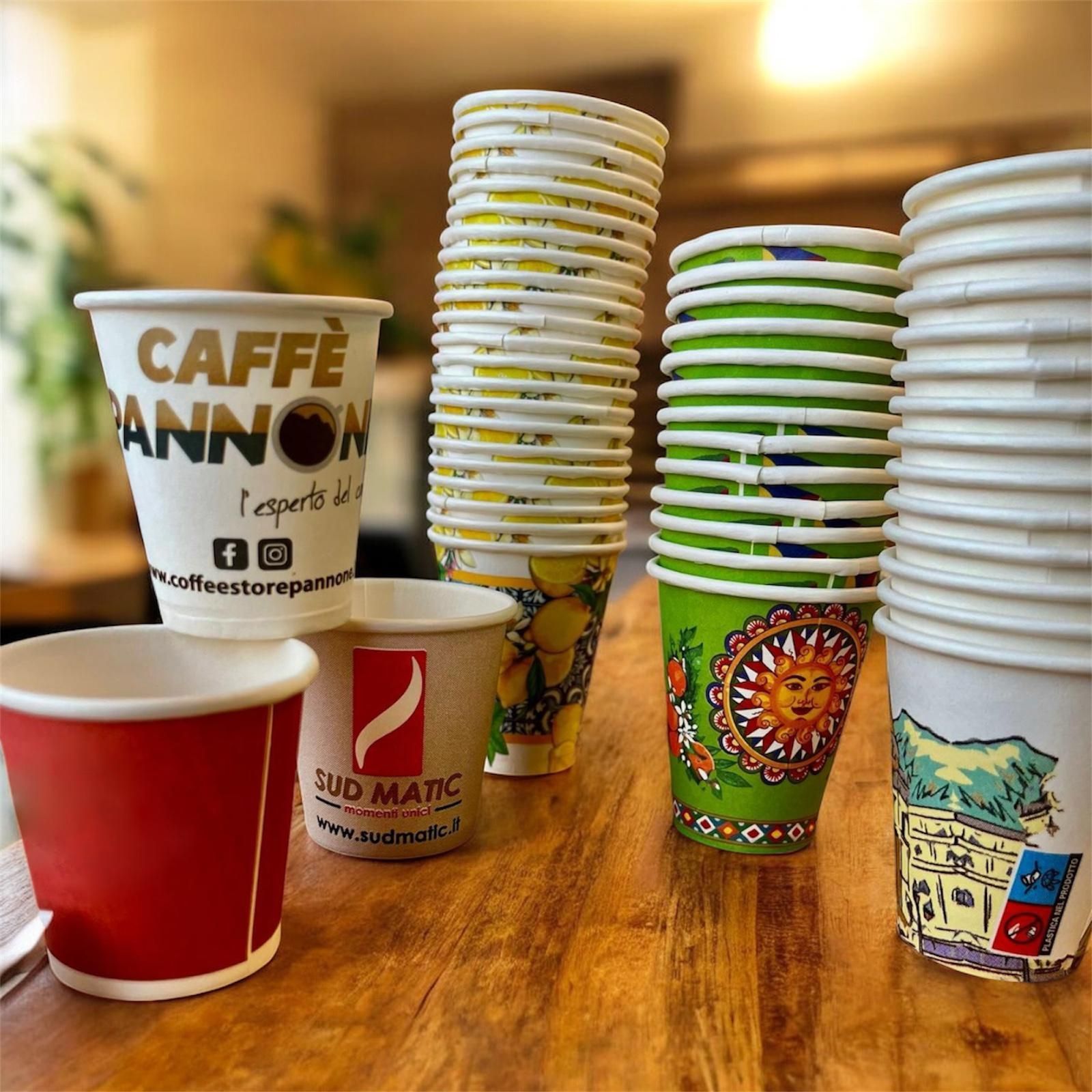- Bicchieri in carta personalizzati: Disponibili in vari formati, ideali per caffè, cappuccini e bevande calde o fredde.